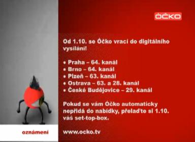 Nejedná se o jedinou novinku. Óčko se od 1.října vrátilo do digitálního vysílání. „Když jsme odcházeli z multiplexu společnosti CDG, jasně jsme řekli, že do pozemního vysílání se vrátíme v okamžiku, kdy to pro nás bude výhodné. Jsme příjemně překvapení, že se nám to povedlo v tak krátkém čase a že jsme našli další možnosti, jak dostat náš signál k divákům,“ vysvětluje Hynek Chudárek, výkonný ředitel hudební televize Óčko, v tiskové zprávě.