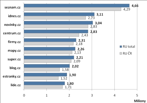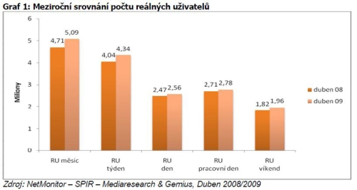 GRAFY UVNITŘ – Počet reálných uživatelů (RU) na měřených serverech dosáhl v dubnu 2009 téměř 5,09 milionu . Jde o osmiprocentní meziroční nárůst (v dubnu 2008 bylo 4,7 milionu RU). Letošní měsíce březen (5,05 milionu RU) a duben tak potvrdily předpoklad ze začátku roku, že měsíční návštěvnost na českém internetu bude v roce 2009 převyšovat hranici 5 milionů.