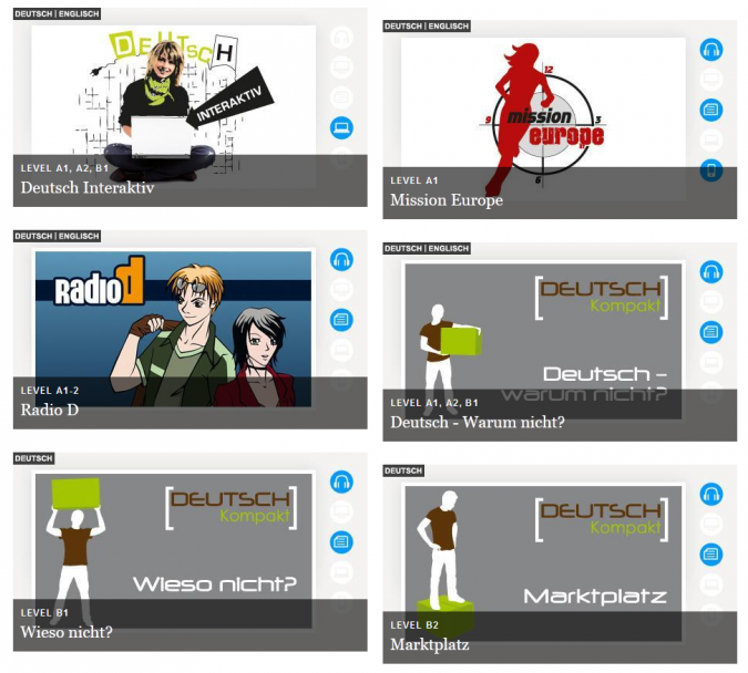 Pro uživatele základních znalostí německého jazyka je určen seriál „Deutsch – warum nicht?“ (úroveň A1-B1). Během jednotlivých dílů sledujeme příběhy studenta Andrease. Celkem byly natočeny 104 díly, během nichž byly představeny cvičení, dialogy a audia se zaměřením na základní gramatické jevy. Neméně užitečným rádcem je „Audiotrainer„, ten je připraven pro naprosté začátečník a zabývá se tématy jako osobní zájmena, doprava, rodina, číslovky, pocity, zdraví a další.