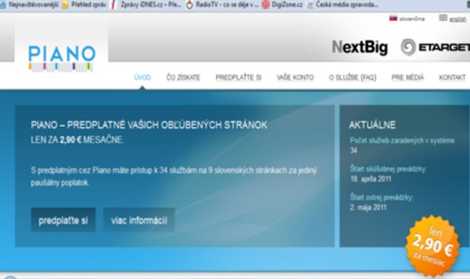 Už jen tři dny zbývají do startu zkušebního provozu projektu Piano, který si klade za cíl změnit nejprve slovenský a později i český internet, prostřednictvím zpoplatnění zpravodajských webových stránek a serverů. Za projektem stojí společnost NextBig, jejímiž vlastníky jsou například Miloš Čermák, Adam Javůrek, nebo Tomáš Bella.  Jenže z původně proklamovaného záměru zpoplatnit slovenské zpravodajské weby zbývá tři dny před spuštěním pouhé torzo.