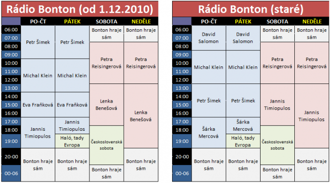 Ve středu 1. prosince prošlo programové schéma Rádia Bonton několika úpravami, zároveň se proměnila délka vysílacích bloků. Petr Šimek se z odpoledne stěhuje na ranní blok 6-10, který se zároveň prodloužil o hodinu. David Salomon přechází na pozici ranního zprávaře. Michal Klein zůstává prakticky ve stejném čase 10-14, odpolední proud získal novou posilu v podobě Evy Fraňkové (14-17), ta přechází z Expresradia. Večerní proud obstarává Jannis Timiopulos (dříve víkendová odpoledne). Zprávařka Lenka Benešová přesídlila na víkendová odpoledne a v roli moderátorky.