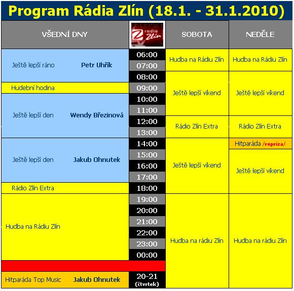 V pondělí 18.1. se rozjede nové programové schéma, Ještě lepší ráno s Petrem Uhříkem (6-9) a Hudební hodina (9-10) zůstávají. V bloku 10-14 uslyšíte Wendy Březinovou, 14-18 Jakuba Ohnutka. 18-19 následuje hodina s názvem Rádio Zlín Extra, jejíž náplň je zatím nejasná. I nadále zůstávají pravidelné rubriky Auto-Moto, Cinemabox, Internet, Expres, Lifestyle, Kalendárium atd.