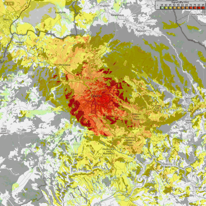 Radiomobile – Mapka Liberec – Vratislavice (100 W). Zdroj: DXRadio.cz/JIDXC