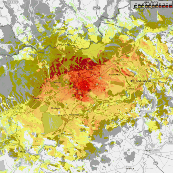 Radiomobile – Mapka Teplice – Boží prst (100 W). Zdroj: DXRadio.cz/JIDXC