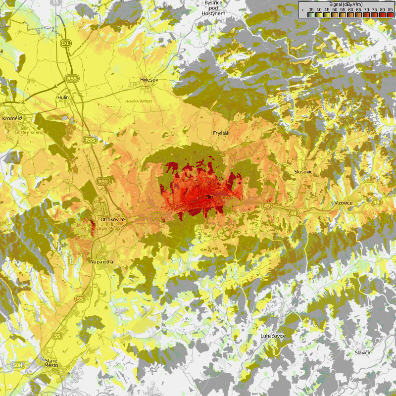 Radiomobile – Mapka Zlín – Šedesátá (100 W). Zdroj: DXRadio.cz/JIDXC