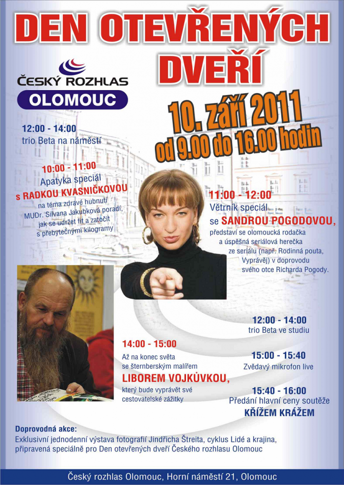 Součástí dne otevřených dveří je bohatý doprovodný program. Už v 10.00 představí moderátorka Radka Kvasničková v pořadu Apatyka speciál doktorku Silvanu Jakubalovou, ta prozradí, jak být v kondici. O hodinu později začíná Větrník s olomouckou rodačkou a známou herečkou Sandrou Pogodovou. Až na konec světa se šternberským malířem Liborem Vojkůvkou zavítají návštěvníci ve 14.00.