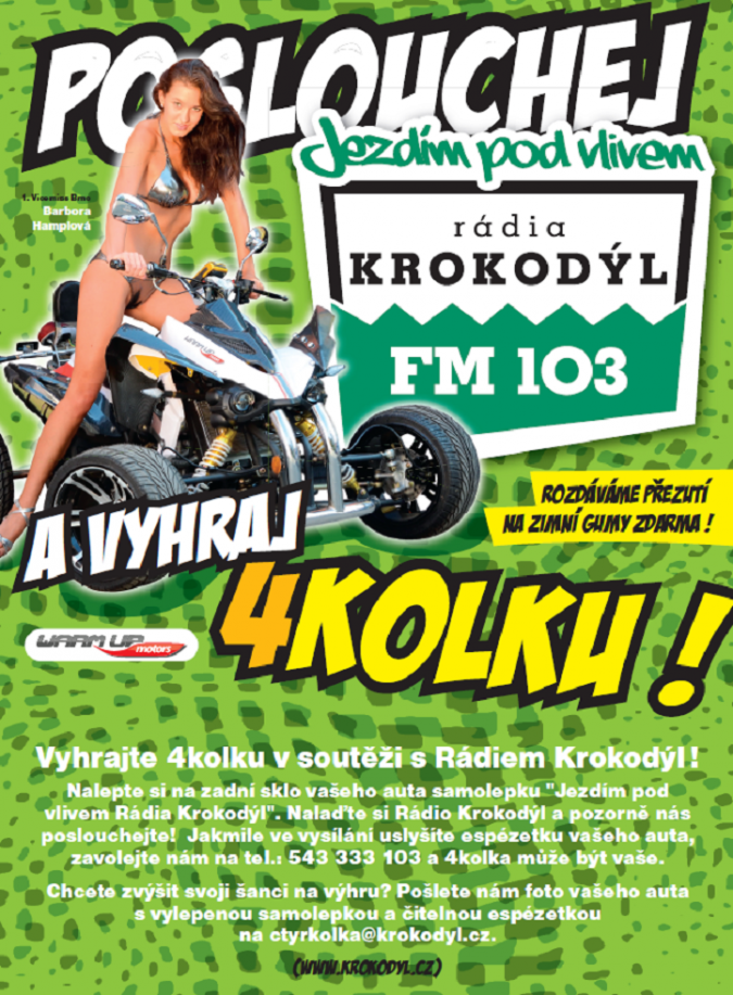 Ten, kdo si vylepí samolepku na zadní sklo auta, svůj osobní vůz vyfotí včetně čitelné registrační značky a snímek zašle na ctyrkolka@krokodyl.cz, může vyhrát čtyřkolku v hodnotě 80 tisíc korun českých. Samolepku s nápisem „Jezdím pod vlivem Rádia Krokodýl“ získáte buď přímo v sídle Rádia Krokodýl, u promo hlídek v ulicích Brna, resp. si o ni můžete napsat na e-mail promo@krokodyl.cz.