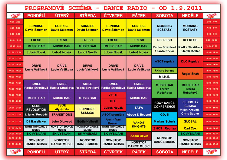 Schéma Dance Radia doznalo od září několika programových změn. Základní programovou osu tvoří čtyři základní bloky, SUNRISE 6-9 s Davidem Salamonem (dříve vysílal na Rádiu Bonton), FRESH 9-12 s Lubošem Novákem, DRIVE 12-16 s Lucií Vašíčkovou a v neposlední řadě SMILE 16-20 s Radkou Stratilovou.