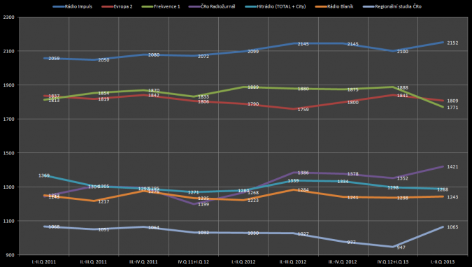 Rádio Impuls drží první příčku s 2,152 milionu posluchačů týdně, výsledky jsou stabilní, což značí mezikvartální a meziroční nárůst o 50 tisíc. Dvojkou je nově rádio Evropa 2 (1 809 / -32 / +19), Frekvence 1 (1 771 / -117 / -118) lehce oslabuje. Výrazněji se z celoplošných okruhů dařilo Českému rozhlasu, okruh Radiožurnál (1 421 / +69 / +153) meziročně posílil o více než 10%.