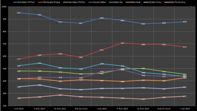 Srovnání poslechovosti vybraných rádií, pro zvětšení klikněte myší