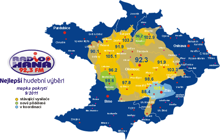 MAPA POKRYTÍ UVNITŘ – Brněnské Free Radio 107 FM zlepšuje své pokrytí, nově se hudební formát dance a r’n’b šíří ze stanoviště Kohoutovice/hotel Myslivna 369+27m a 440W ERP. Nadále Free Radio 107 FM bojuje o nové dokrývače, navíc by rádo expandovalo za hranice Brna. Na pravou míru uvádíme seznam kmitočtů Rádia Haná, které udělila RRTV na letošním 15. zasedání.
