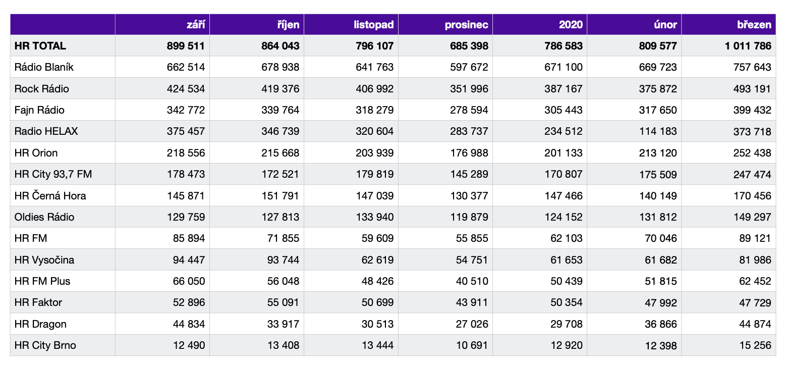 Online poslech rádií prostřednictvím aplikace radia.cz zaznamenal za měsíc březen také miliónový rekord. Hitrádio TOTAL má poprvé v historii přes milion poslechů za předcházející měsíc.