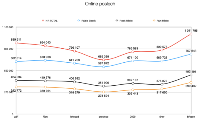 Vývoj online poslechu zaznamenal i u ostatních regionálních rádií zastupitelství Radiohouse výrazný nárůst v měsíci březnu oproti předcházejícím měsícům.