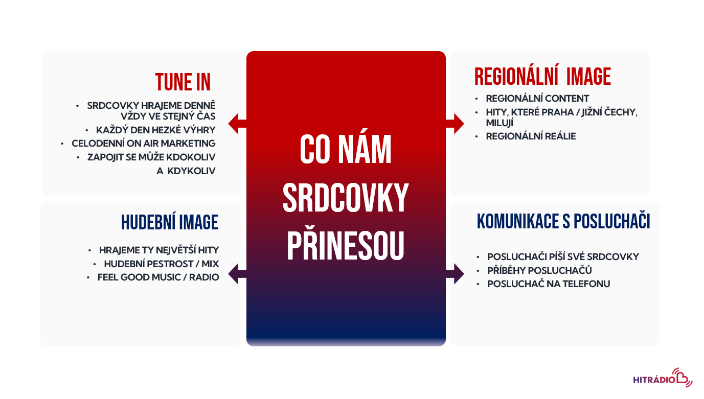 Nový jednotící programový prvek koresponduje s dlouhodobou hudební strategií Hitrádií, kterou mají stanice definovanou v claimu Máme srdce, které hraje…. Navíc budou progresivní změnou v programově velmi komplikovaném čase. „Late morning show, tedy hodina, která navazuje na ranní show a uvádí dopoledne, je velmi obtížná pro všechny stanice v Evropě. Forma poslechu se mění z aktivní na pasivní, část posluchačů ještě chce aktivní zábavu a část už ne, my navíc z centrálního vysílání přecházíme do regionálního. Srdcovky jsou cestou, jak vyřešit všechny tyto výzvy jednou elegantní a atraktivní formou“, vysvětlil důvody, které vedly ke vzniku prvku, programový ředitel sítě Hitrádií Michal Merenda. Srdcovky se navíc již v průběhu léta osvědčily na pražském Hitrádiu City 93,7 FM, proto se od září implementují i do dopoledního vysílání jednotlivých regionálních stanic. Megahity, na které možná už běžný posluchač zapomněl, ale když se mu připomenou, tak je určitě zařadí mezi své srdcovky, budou v čase mezi 9:00 – 10:00 hod. připomínat regionální moderátoři. „Navíc počítáme i s interaktivitou, ať už v on-air vysílání nebo přes sociální sítě jednotlivých regionálních rádií, kde budou moci posluchači prozrazovat své „srdcovky“ včetně svého vztahu k nim. My jim je pak samozřejmě zahrajeme, “ vysvětluje Michal Merenda a dodává: „Srdcovky jsou tak produktem, který byť bude centrální a obchodně snadno uchopitelný, tak je založen na regionálním pojetí vysílání, regionálních vzpomínkách a reáliích a nabízí jednotlivým stanicím určitou míru autonomie. A to je cesta, kterou chceme s Hitrádii do budoucna jít.“ Produkt Srdcovky vychází také vstříc dlouhodobé poptávce zadavatelů reklamy, kteří vyhledávali na Hitrádiích atraktivní programovou záležitost, která by jednak ctila regionální charakter, současně ale byla jednotícím prvkem pro všechny regionální stanice a nabízela celoplošný zásah.