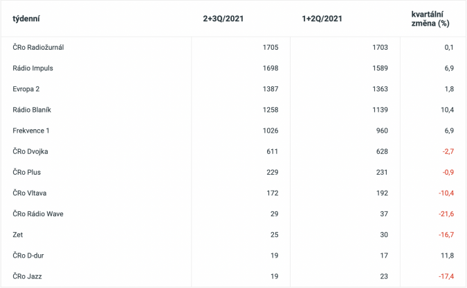 Poslechovost týdně celoplošných stanic (tis. osob)