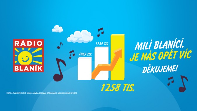 U Rádia BLANÍK platí, že rádo hraje hezky česky a vysílá dobré zprávy, to potvrzuje i programový ředitel Rádia BLANÍK Daniel Rumpík: ,,máme velkou radost, že se můžeme podělit o jednu pozitivní zprávu, která se týká přímo nás. Naše blanická rodina se opět rozrostla – a to opravdu významně. Podle nejnovějšího průzkumu poslechovosti RadioProjekt si nás alespoň jednou týdně naladí 1.258 tisíc posluchačů, což je o 119 tisíc víc než před čtvrt rokem.“