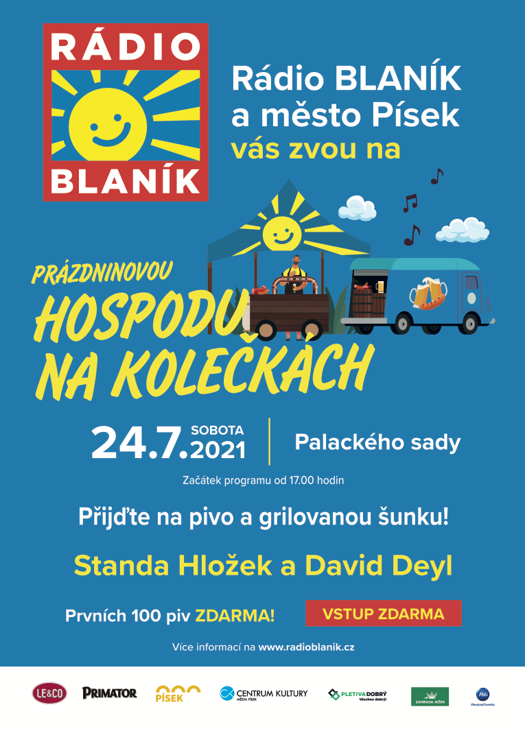 Zítra 24.8. zamíří prázdninová hospoda do Písku, kde se na vás bude těšit celý blanický tým. Pípy blanické putovní hospůdky se roztočí v 17 hodin v Palackého sadech. I zde pro vás samozřejmě chystá tým Rádia BLANÍK prázdninový program se spoustou písniček a dobrého jídla a pití. Čepovat se bude orosený Primátor a na grilu bude šunka na kosti Le&Co. Kdo má radši nealko, může si dát točenou limonádu a k tomu spoustu dalších dobrot. Prvních 100 piv bude i tentokrát zdarma a přichystány budou i soutěže o skvělé ceny. Pestrý bude i hudebním program, zazpívají Standa Hložek a David Deyl. Vstup je zdarma!