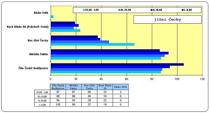 V tomto kraji není vítěze, o první příčku se „perou“ hned dvě rádia, obě klesala – ČRo České Budějovice (87 / -1) i Hitrádio Faktor (87 / -3). Ještě před rokem poslouchalo Český rozhlas 109 tisíc, Hitrádio Faktor potom 73 tisíc. Velmi silný posun směrem vzhůru zaznamenalo rádio Kiss Jižní Čechy, denně si tuto stanici naladí 66 tisíc, což je o 20 tisíc více než při minulém výstupu poslechovosti. Posíleno z průzkumu vychází také Rock Rádio Jih (23 / +5). Dva tisíce posluchačů zaznamenalo Rádio Orlík.