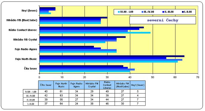 Sever republiky je (co se týče poslechovosti) poměrně stabilní a výrazné změny se tu ke slovu nedostávají. Výrazný posun kupředu nastal u Rádia Contact Liberec (49 / +10), přesto se ve srovnání s minulým rokem jedná jen o nárůst mírný. Zhoršení nastává u Hitrádia FM Crystal (29 / -5). Vezmeme-li v úvahu 3 RadioProjekty zpět, klesá o 9 tisíc. Shodně po dvou tisících tratí ČRo Sever (40 / -2) a Fajn North Music (61 / -2). Bez rozdílu s minulým výstupem se drží Fajn Radio Agara (34) a Hitrádio FM (27). Jeden tisíc k dobru má Hey! Sever (5).