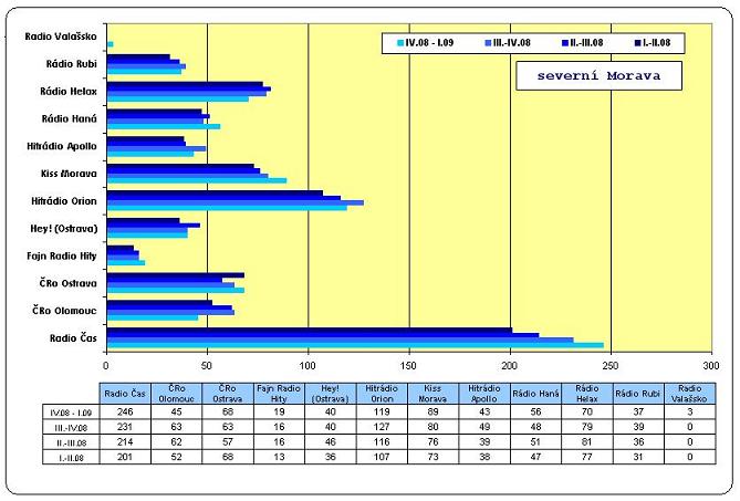 Někde se daří, v jiných regionech je to horší. Velké zhoršení zažilo studio ČRo Olomouc, kleslo o 18 tisíc na 45. ČRo Ostrava o 5 tisíc posílila na 68 tisíc, v minulém výstupu měla obě regionální studia shodný počt posluchačů. Asi nikoho nepřekvapí, že v čele se drží Rádio Čas (246), v kraji nejvíce posílila (o 15 tisíc), v meziročním srovnání si zlepšilo rádio výsledky o 31 tisíc posluchačů. I nadále má o více jak polovinu posluchačů méně Hitrádio Orion (119 / -8), to oslabilo. Meziročně si však na konto připisuje 9 tisíc nových posluchačů. Silné posílení „zastihlo“ také Rádio Haná (56 / +8) a Kiss Morava (89 / +9). Pád pak přichází k rádiu Helax (70 / -9).