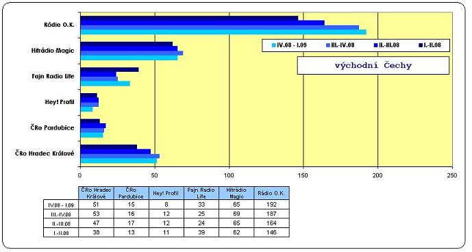 Ani zde se pořadím nikomu výrazněji zamíchat nepodařilo. Nejvíce posilovalo Fajn Radio Life (33 / +8), nejposlouchanějším programem regionu je Rádio O.K. (192 / +5), v meziročním srovnání začalo poslouchat Rádio O.K. 48 tisíc nových posluchačů. Na dalších pozicích následují Hitrádio Magic (65 / -4), ČRo Hradec Králové (51 / -2), ČRo Pardubice (15 / -1) a poslední končí Hey! Profil (8 / -4), ztratilo třetinu posluchačů.