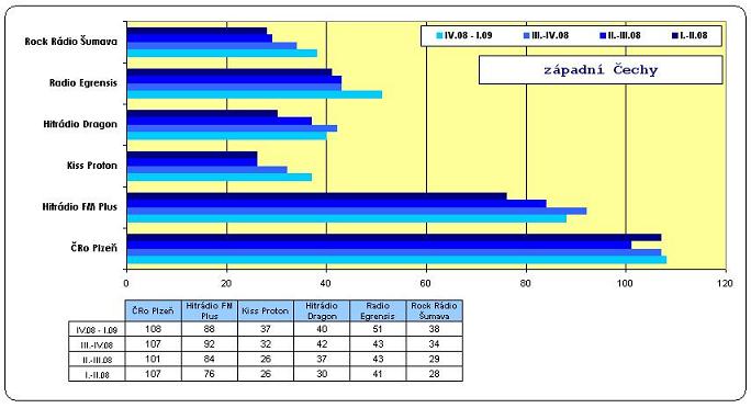 Dominanci v regionu drží i nadále ČRo Plzeň, denně jej stále ladí 108 tisíc posluchačů, vychází posíleno o jeden tisíc, rádio dlouhodoběji stagnuje. Stříbro putuje Hitrádiu FM Plus (88 / -4), na lídra mírně ztrácí, leč konkurence je relativně zatím stále vzdálena. Třetí příčka patří Rádiu Egrensis (51 / +8) před Hitrádiem Dragon (40 / -2), Rock Rádio Šumava (38 / +4) a Kiss Proton (37 / +5).