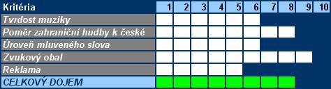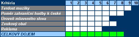 V rockových recenzích budu hodnotit „tvrdost muziky“ (dodávám, že je to pro lepší orientaci čtenáře v případě, že by některé z rádií chtěl naladit), poměr zahraniční a české tvorby, úroveň mluveného slova, dojmy ze zvukového obalu a reklamu (konkrétně její množství). Do celkového hodnocení nezapočítávám „tvrdost muziky“, stejně tak jako poměr zahraniční a české tvorby. Celkový dojem jednoduše značí pocity a zážitky získané během poslechu. Rád bych podotknul, že rockovou muziku mám rád… :)
