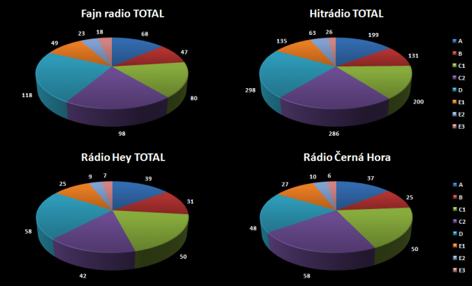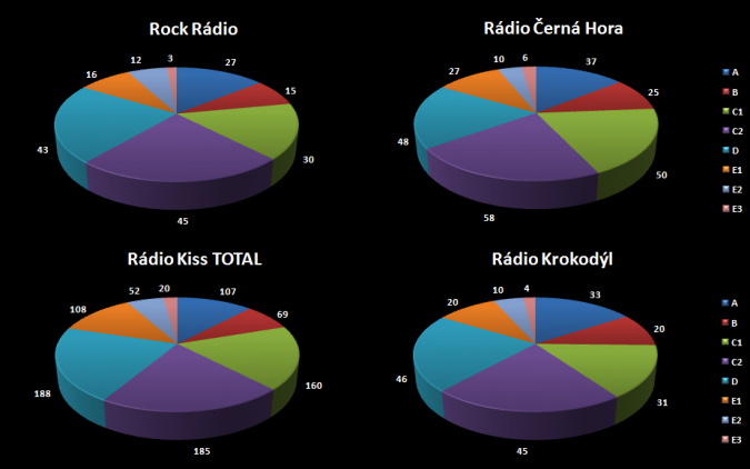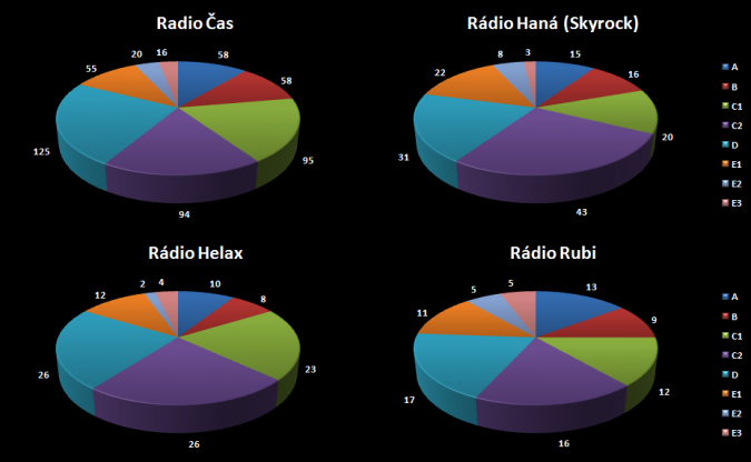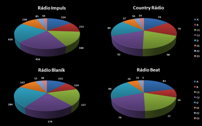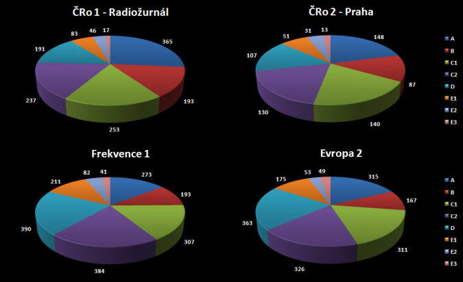 Ve třídě C2 si Rádio Impuls získalo silnější postavení (456 / 228) než u vyšší C1 (340 / 170), opačná situace je u Radiožurnálu, kterému se daří lépe v C1 (253 / 139) než v C2 (237 / 132).