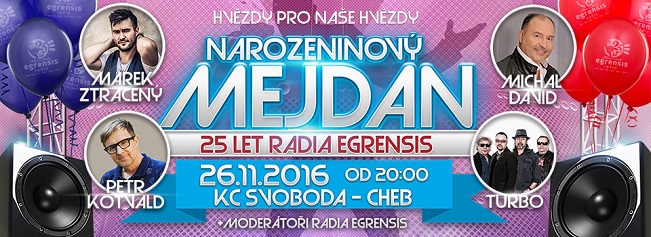 Radio Egrensis si připomene 25. výročí 26. listopadu v KC Svoboda Cheb. Vstupenky na narozeninový koncert lze zakoupit přes internetové stránky rádia. Hlavní hvězdou bude Michal David, dále vystoupí Marek Ztracený, Petr Kotvald a skupina Turbo. Přítomni budou také všichni moderátoři.