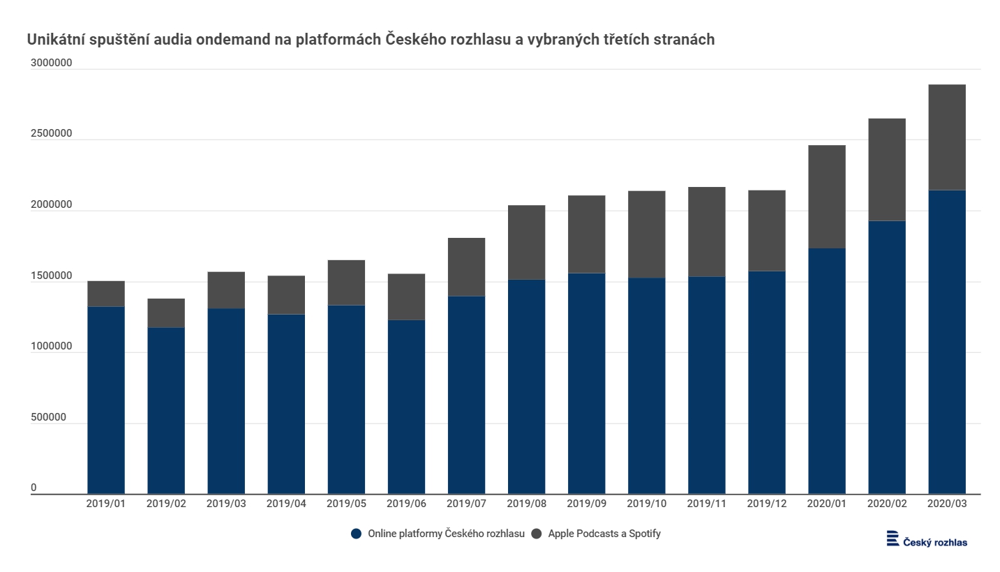 Český rozhlas zaznamenal za březen rekordní zájem o audio služby. Rozhlas.cz a mujRozhlas.cz navštívilo více než 2,2 mil. reálných uživatelů, kteří si spustili více než dva milióny audií. Na třetích stranách včetně YouTube si uživatelé spustili dalších 4,6 miliónů audií s obsahem Českého rozhlasu.