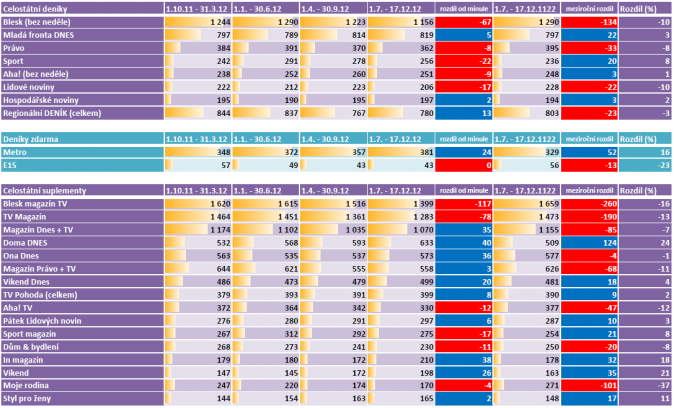 Nejčtenějším deník zůstává deník Blesk, meziročně však přišel o 10% posluchačů, což v absolutních číslech znamená 134 tisíc. Na vydání má 1,156 milionu, od druhého deníku MF Dnes jej před rokem dělilo půl milionu, aktuálně je to cca. 350 tisíc. Rozdíly byly smazány i mezi Hospodářskými novinami (197 tisíc) a Lidovými novinami (206 tisíc).