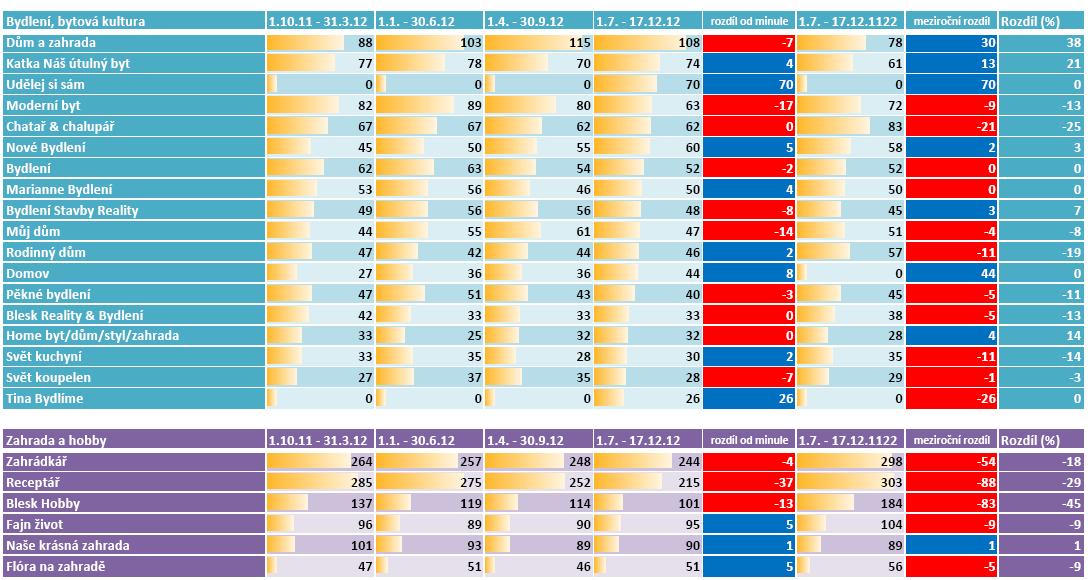 Dům a zahrada (108 tisíc čtenářů na vydání) si drží pozici nejčtenějšího titulu ve svém segmentu. V segmentu Zahrada a hobby vede nově Zahrádkář (244 tisíc), meziročně ale ztratil 54 tisíc. Ještě větší meziroční ztrátu má však Receptář (215 / -37 / -88), největší meziroční propad – téměř 50% – zaznamenal titul Blesk Hobby (101 / -13 / -83).