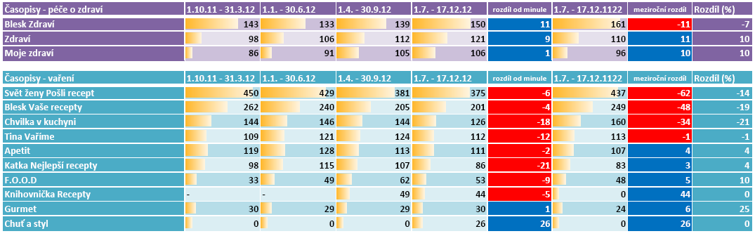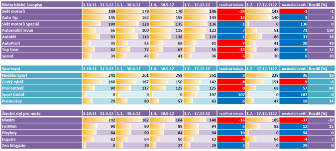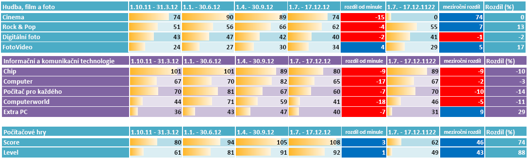 KOMPLETNÍ VÝSLEDKY UVNITŘ – Aktuální výsledky čtenosti nechybí ani v tomto měsíci, doplňme, že jsou měřena v rámci MediaProjektu. Ten byl realizován společnostmi GfK Praha – Median. V období 1. 7. 2012 – 17. 12. 2012 bylo dotazováno 12 688 náhodně vybraných respondentů z celé České republiky. Mimo analýzu vám nabízíme srovnání vývoje čtenosti u všech českých sledovaných periodik a to v pěti po sobě jdoucích vlnách.