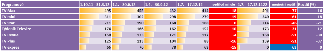 TV Max (414 / -18 / -77) drží vedoucí postavení. Z celkového pohledu ale tituly meziročně přišly o zhruba pětinu čtenářů. V absolutních číslech ztrácí nejvíce TV Max, v procentech ztrácí nejvíce TV Plus (88 / -16 / -51), ztratil 37% čtenářů.