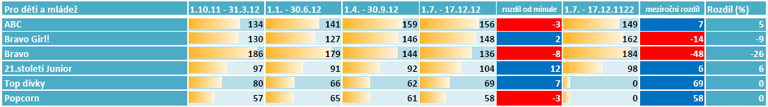 ABC (156 / -3 / +7) obhájilo prvenství, čtvrtinu čtenářů meziročně ztrácí Bravo (136 / -8 / -48), které je až třetí za Brvo Girl! (148 / +2 / -14). Lehce posílilo 21. století Junior (104 / +12 / +6).