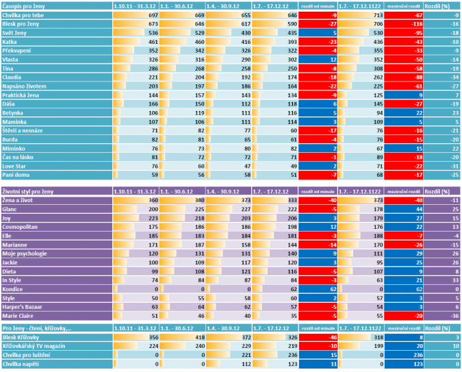 Chvilka pro Tebe zaznamenala čtenost 646 tisíc, druhý Blesk pro ženy 435 tisíc. Významný meziroční nárůst sledujeme u magazínu Betynka (116 /+6 /+22), téměř třetinu čtenářek ztratil Love Star (49 / +2 / -22).
