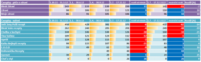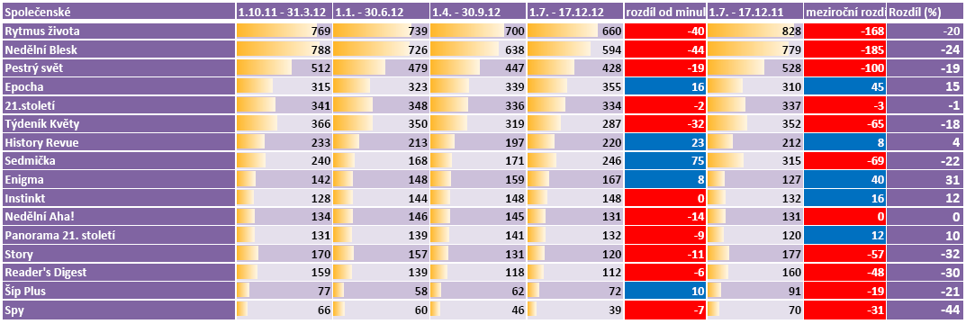 Rytmus života meziročně ztratil 168 tisíc čtenářů, po odchodu pětiny čtenářů vykázal výsledek 660 tisíc. Ani druhý Nedělní Blesk (594 / -44 / -185) nemůže být s meziročním srovnáním spokojený, ztratil 185 tisíc, což je 25%. Pestrý svět (428 / -19 / -100) přišel též o pětinu čtenářů. Titul Sedmička díky své nízké ceně (246 / +75 / – 69) opět stoupá vzhůru.