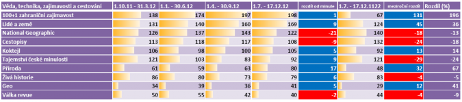Lidé a země (169 /+9 /+45) nadále rostou, naopak National Geographic (122 /-21 /-18) mírně oslabuje. Tajemství české minulosti (92 / +9 / -29) má 92 tisíc čtenářů. Sesterské tituly Živá historie (79 / +6 / -4) a Válka revue (40 / -2 / -4) mají vyrovnané výsledky. Významný nárůst má na svém kontě titul Příroda (80 / +17 / +32), dokázal přilákat o dvě třetiny čtenářů více než před rokem.