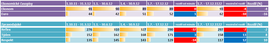 Ekonom čte pravidelně 89 tisíc čtenářů, druhé Euro o 37 tisíc čtenářů méně. První týdeník má stabilní výsledky, pravidelně se pohybuje okolo hranice 90 tisíc, a má tak jednu z nejstabilnějších skupin čtenářů.