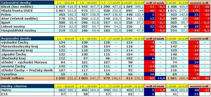 Jak už bylo napsáno v úvodu, nejčtenějším deníkem zůstává neohroženě Blesk, od minule klesnul o 21 tisíc na 1,369 milionu, meziročně ztratil 37 tisíc čtenářů. Mladá fronta DNES meziročně přišla o 179 tisíc čtenářů a čte ji nyní 892 tisíce. Ve srovnání s loňským rokem zastihnul úbytek čtenářů v celkovém součtu i Deník, nyní jej čte 914 tisíc, od minula klesnul o 65 tisíc, meziročně hned o 167 tisíc.