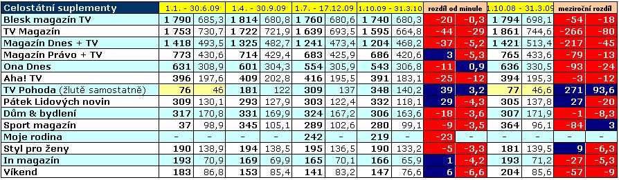 Jedničkou v oblasti suplementů je i tentokrát Blesk magazín TV, nyní má 1,74 milionu čtenářů (od minule -20 / meziročně -54), dvojkou je oslabený TV Magazín s téměř 1,6 milionem čtenářů, meziročně se propadá o 266 tisíc. Propad zastihnul též Magazín Dnes + TV s 1,2 milionu, meziroční propad činí 217 tisíc. O 44 tisíc byl též snížen vložený náklad, meziročně toto číslo činí 80 tisíc.
