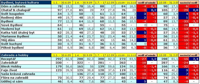 Jen velmi malé odstupy zaznamenáváme v případě titulů o bydlení, nejvíce čtenářů udržuje Dům a zahrada s 84 tisíci čtenářů, hůře je na tom Chatař & chalupář, nyní jej čte 76 tisíc, od loňského roku spadnul o 29 tisíc, o 33 tisíce na 56 tisíc spadlo Bydlení.