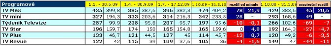 Hned dva tituly zažívají raketový vzestup, první je TV Max s číslem 474 tisíce, od minula jej čte o 78 tisíc, meziročně má navíc 45 tisíc. I dvojka TV mini s číslem 342 tisíce si ve srovnání s minulým výstupem polepšila (konkrétně o 28 tisíc), meziročně má navíc 49 tisíc. Naopak strmý pád zaznamenal Týdeník Televize s číslem 197 tisíc, od minule ztráta jen 13 tisíc, meziročně jsou ale čísla nižší o 69 tisíc. Na dno tabulky spadlo TV Revue s 105 tisíci, před rokem měl titul o 44 tisíc čtenářů více.