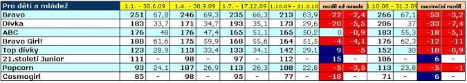 Mladí čtenáři nadále nejvíce čtou Bravo, číslo 213 tisíc ale znamená meziroční ztrátu 53 tisíce, nedařilo se ani Dívce s 173 tisíci (meziročně o 33 tisíc méně). Nejvíce rostl titul 21. století Junior, od minule zvýšil čtenost o 15 tisíc na 108 tisíc.