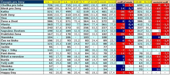 Ženy i nadále preferují Chvilku pro tebe – 691 tisíc, od minule rostl o 9 tisíc, drží těsně první místo před Bleskem pro ženy (679 tisíc čtenářů / od minule + 14 tisíc / meziročně -13 tisíc). Ovšem trojice titulů Katka (481 / -38 / -40), Svět ženy (481 / -38 / -70) a Tina (345 / -41 / -88) zažívají velmi silné propady. Směrem vzhůru stoupá Love Star, od minule má 14 tisíc nových čtenářů nyní jej čtou 54 tisíc, meziročně si polepšil titul dokonce o 31 tisíc.