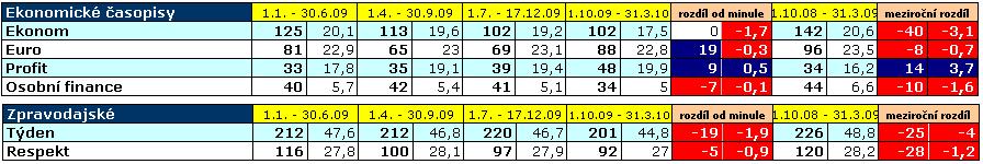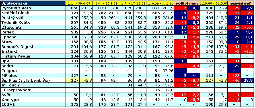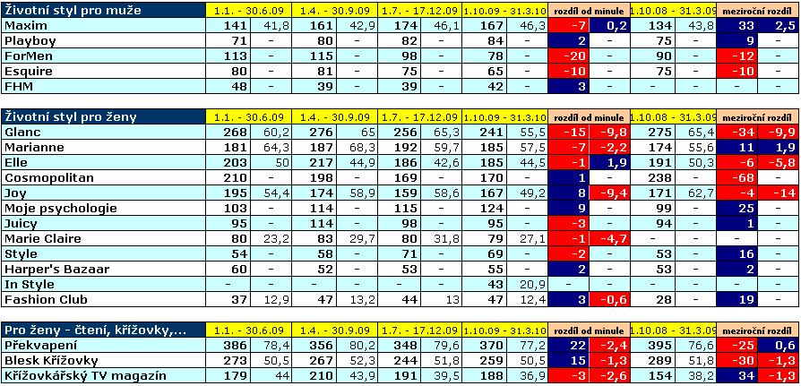 Nově publikované časopisy se uvedly s poměrně slušným potenciálem – Enigma (94 tisíc), Eurozpravodaj (74 tisíc), In Style (43 tisíce) a Snow (24 tisíc čtenářů na vydání).