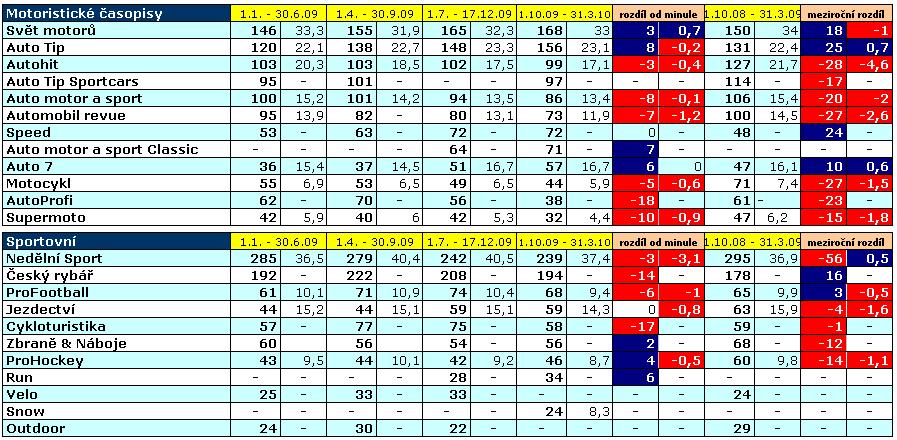 V segmentu sportovních titulů nemá konkurenci Nedělní Sport s 239 tisíci čtenáři, ve srovnání s minulým rokem spadnul o 56 tisíc, Český rybář pak meziročně stoupá o 16 tisíc na 194 tisíce.