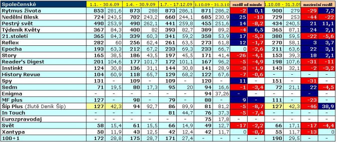 Vzhůru jde i 21. století s číslem 358 tisíc, meziročně ztratil titul 22 tisíc čtenářů. Čtrnáctideník ze stejného vydavatelského domu – Epocha – zůstává na 233 tisících, meziročně stoupala o 22 tisíc. Měsíčníku Svět spadla od minula čtenost o 17 tisíc na 49 tisíc, stejný pokles vykazuje i v meziročním srovnání.