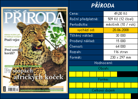 Jedno z mála témat, s nímž jako první přišla konkurence. Vydavatelství RF-Hobby s časopisem vsází především na sílu svého jména a zájem čtenářů. Zklamáním je menší Euro formát (200 x 270 mm), ten nedává vyniknout kráse přírody v plné slova smyslu. Ačkoli jsou k dispozici opět velmi kvalitně zpracované články z oblasti přírody, nemám z časopisu příliš kladný dojem. Připadá mi jako 21.století zaměřené na přírodu, s jinou a méně přehlednou grafikou. Fotografií je také poskrovnu. Na druhou stranu právě informace jsou připraveny opravdu detailně. Forma tedy není nijak oslnivá a graficky je nejlépe ztvárněná titulní strana, ta se vždy opravdu vydaří. Obsah je však nadmíru dobrý. Možná snad jedna součást mi nepřipadá vhodná pro seriózní měsíčník – „Originální rozhovor„. Interview s plejtvákem obrovským se může zdát jako vtipný doplněk, doplnil bych jej spíše do 21.století Junior. Působí rušivě a informace nebyly tak přehledné, jak v jiných článcích.
