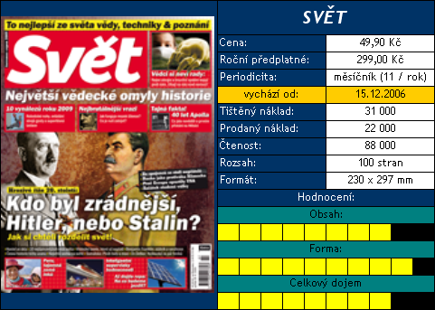 Podívám-li se na všechny hodnocené časopisy, nelze určit jednoznačného vítěze. Extra Publishing přináší kromě kmenového titulu Svět i další, k nejlepším patří bezesporu Příroda, velkoplošné a unikátní fotografie divoké přírody a články předních odborníků přilákají širokou obec obecenstva. RF-Hobby vsází na osvědčenou tvář 21.století a přináší další hodnotné tituly – například History Revue lze jedině ocenit.